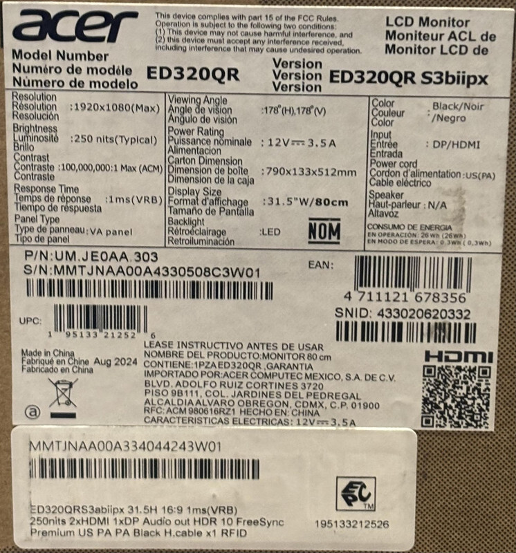 Acer Nitro Edo Series ED320QR VisionCore Display Curved Gaming Monitor FHD 180Hz This item is new with writing on the box as shown.