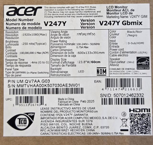 Acer V247y 23.8" Lcd Led 1080p 100hz Monitor w/ Stand And Cord UM.QV7AA.G03 This item is new as shown.