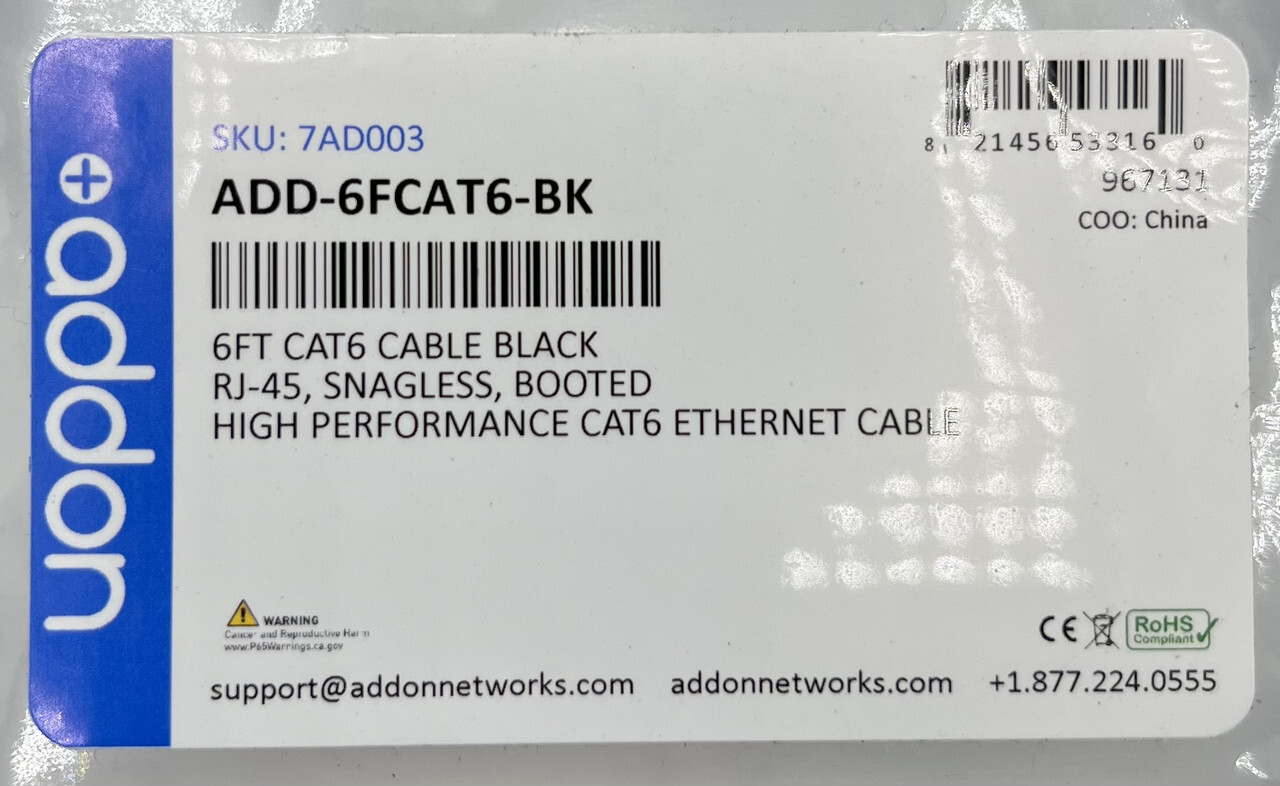 ADDON NETWORKS ADD-6FCAT6-BK RJ-45 HIGH PERFORMANCE ETHERNET BLACK CABLE This item is new as shown.