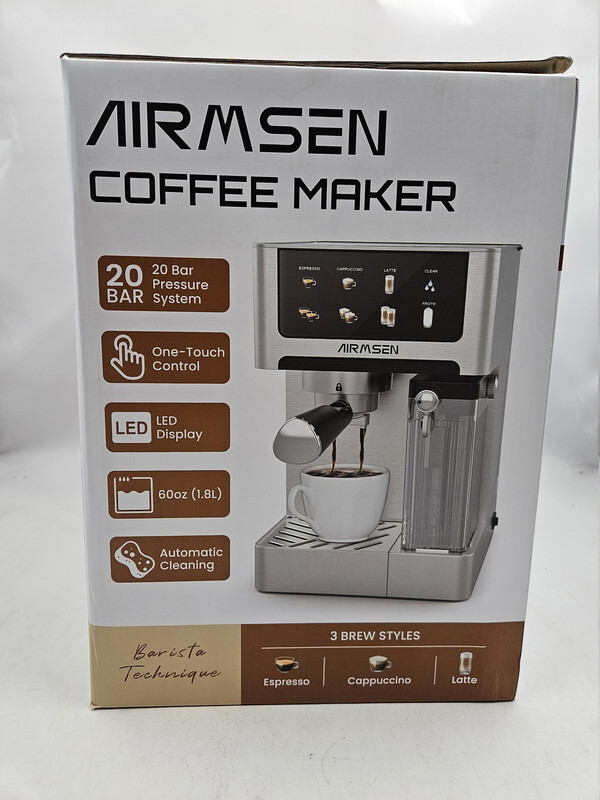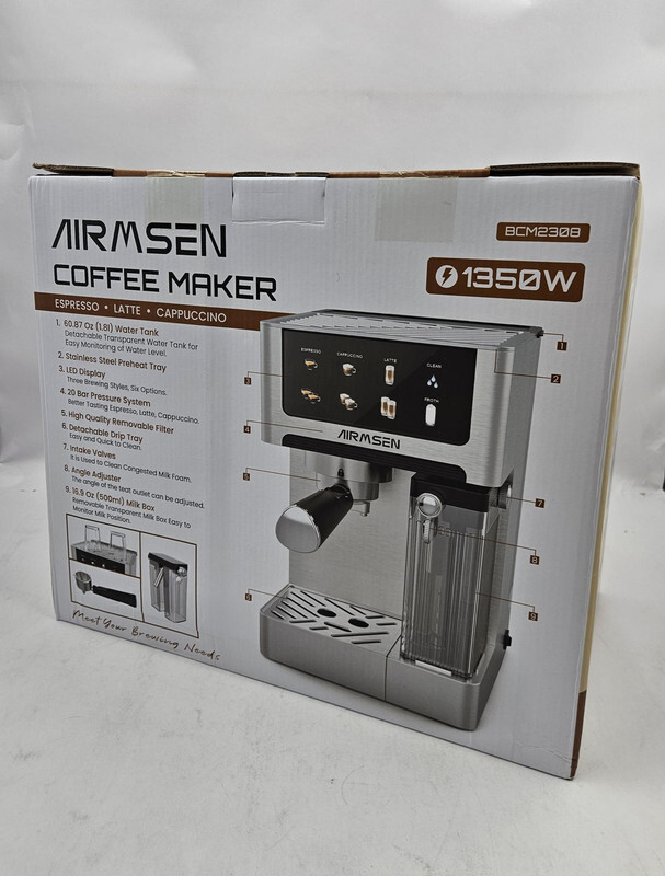 AIRMSEN BCM2308 Coffee Maker 20 Bar Espresso Machine W/Automatic Milk Frother This item is new in a sealed box as shown.