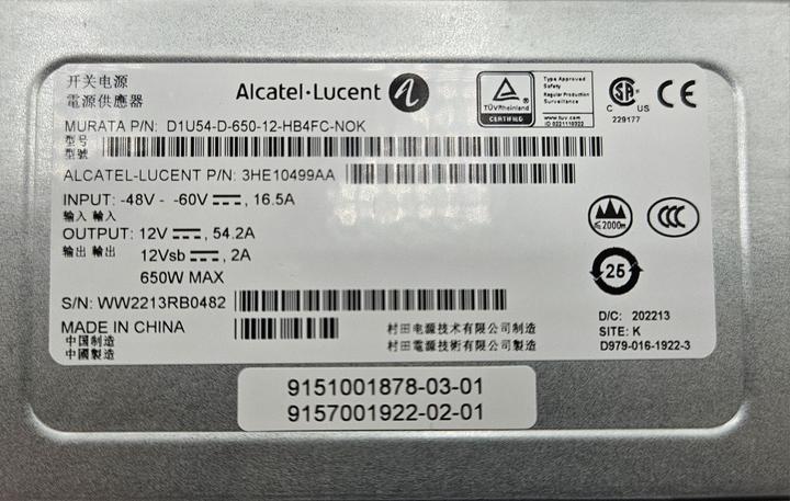 Alcatel Lucent 3he10499aa d1u54-d-650-12-hb4fc-nok Dc 48v 16.5a Power Supply This item is new in open packaging as shown.