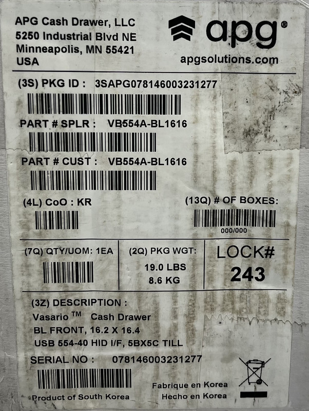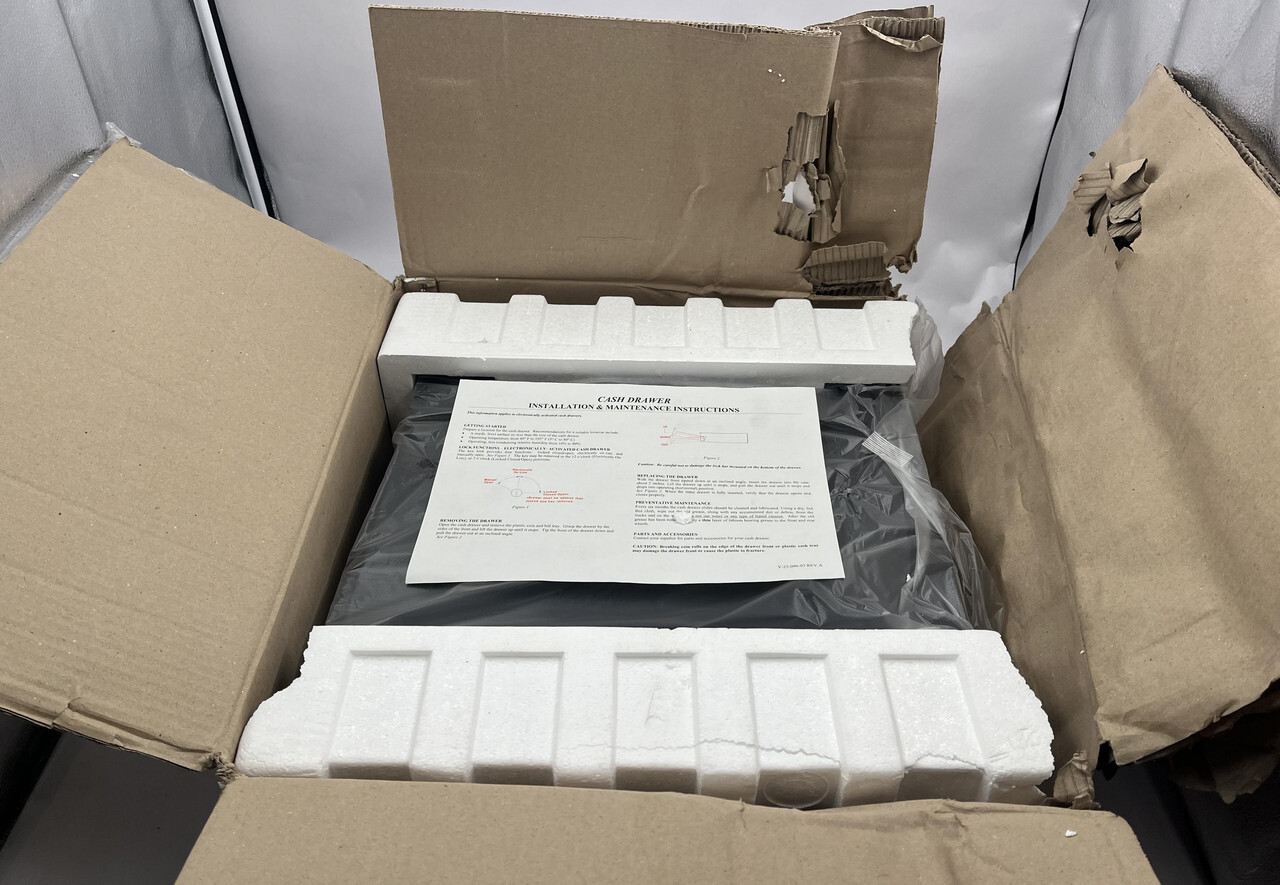 APG VB554A-BL1616 BLACK STANDARD DUTY 5 DRAWER USBPRO POS CASH DRAWER This item is new and comes with two keys in a freight worn box as shown.
