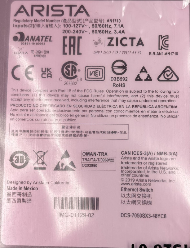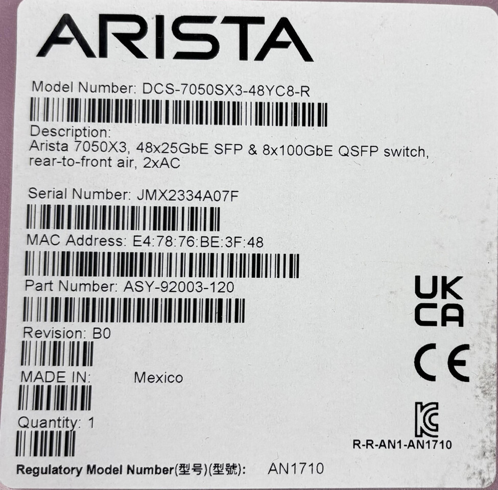 Arista Networks Dcs-7050sx3-48yc8-r ASY-92003-120 Sfp28 Qsfp100 Ethernet Switch This item is new and internally sealed as shown.