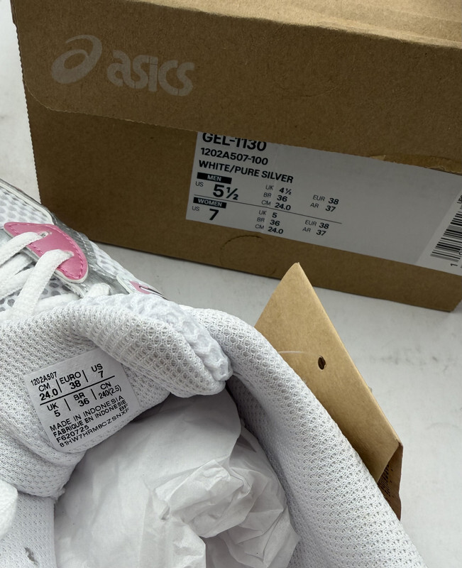 Asics GEL-1130 White/Pure Silver Running Shoe Sz 7 Womens Euro 38 1202A507-100 These shoes are in brand new condtion with orginal box, packaging and tags as shown