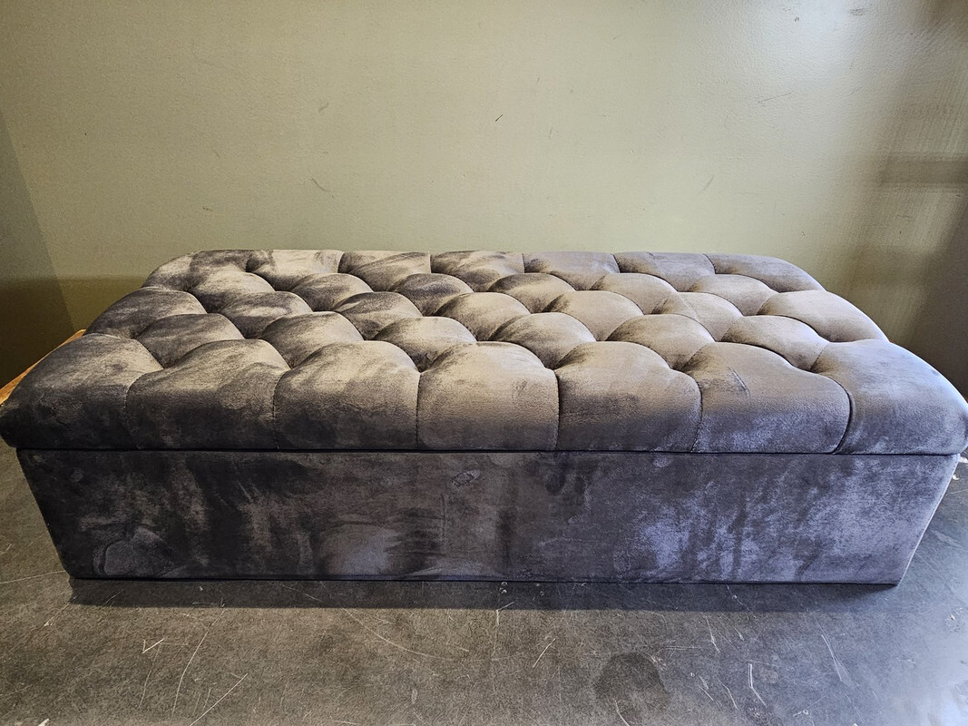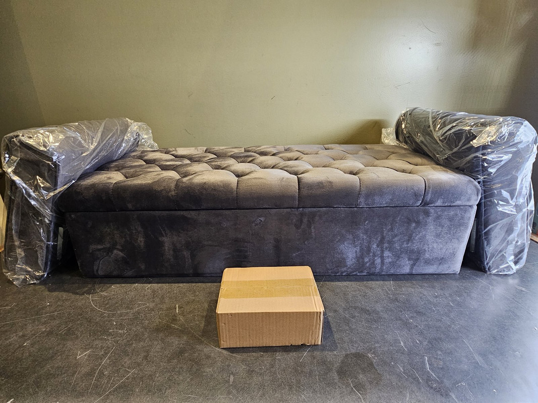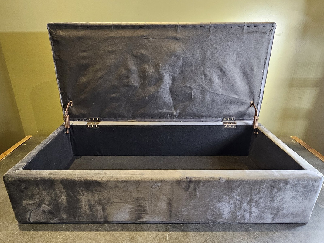 BABION STORAGE BENCH BUTTON TUFTED OTTOMAN UPHOLSTERED DARK GREY 46"x15"x16.73" 52lbs outside of the box This item is new in an opened box as shown.