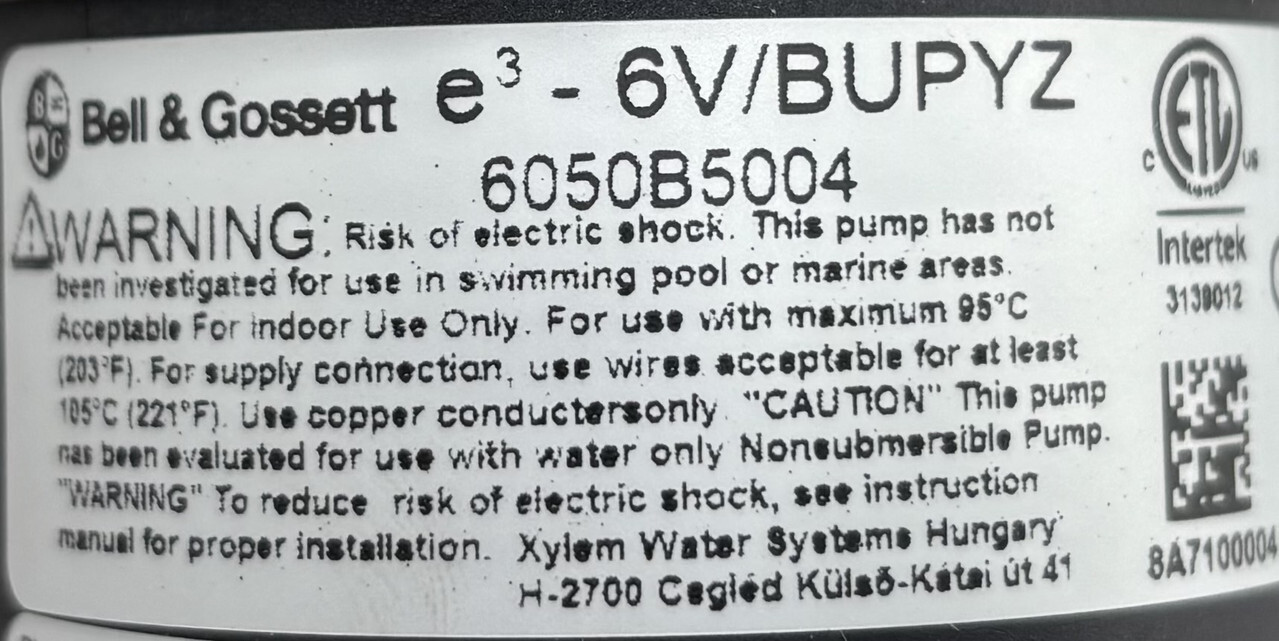 Bell & Gossett e^3-6V/BUPYZ 6050B5004 8A71 Hot Water Recirculation System This item is new as shown.