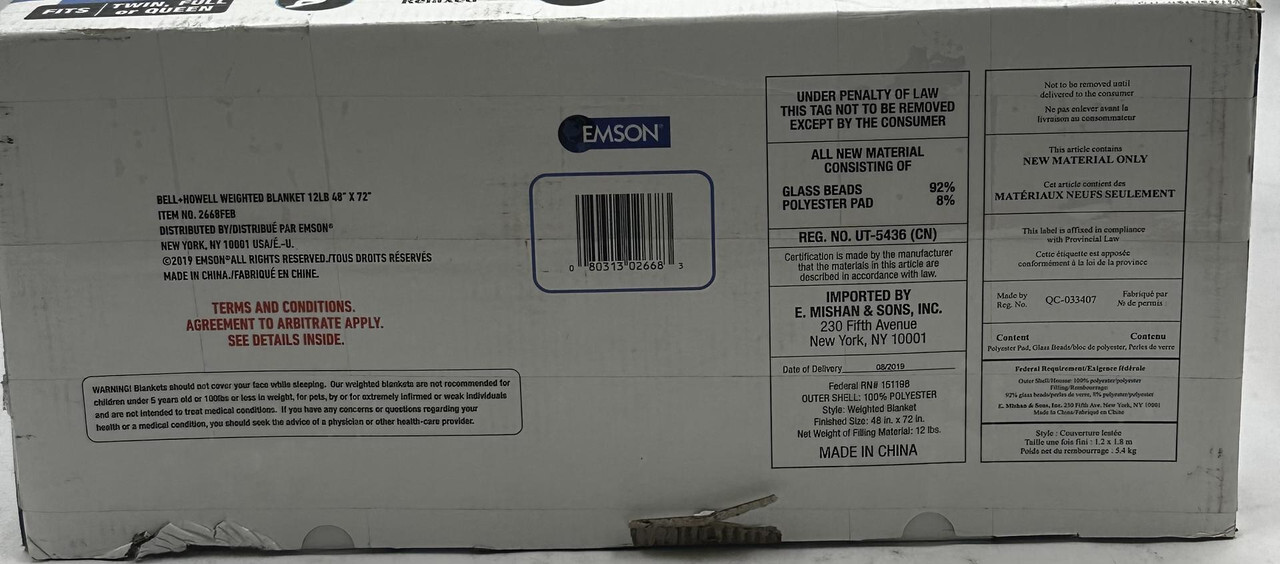 BELL HOWELL 2668Feb 12LB WEIGHTED BLANKET WITH MICRO BEADS FILLING This item is brand new and sealed as shown.