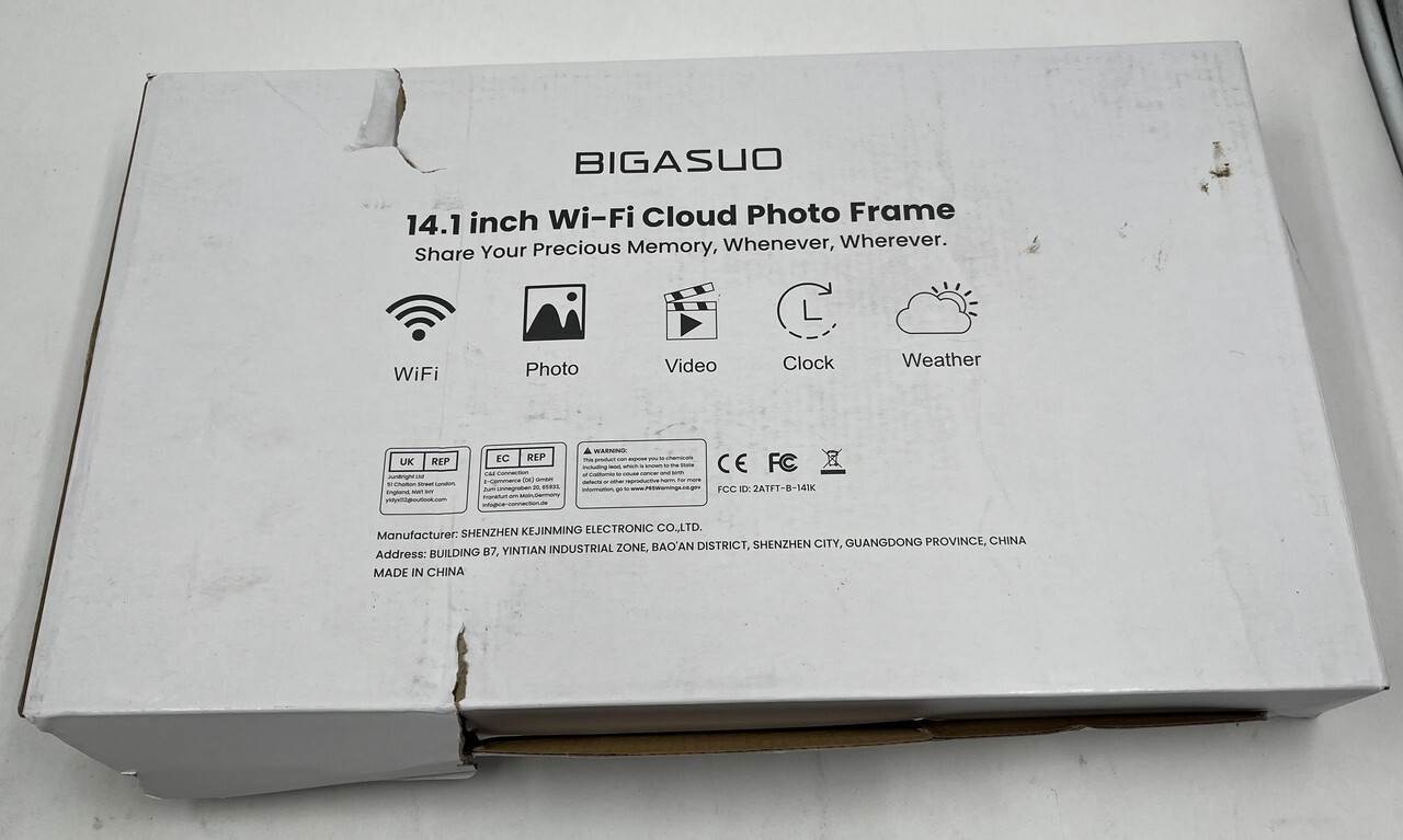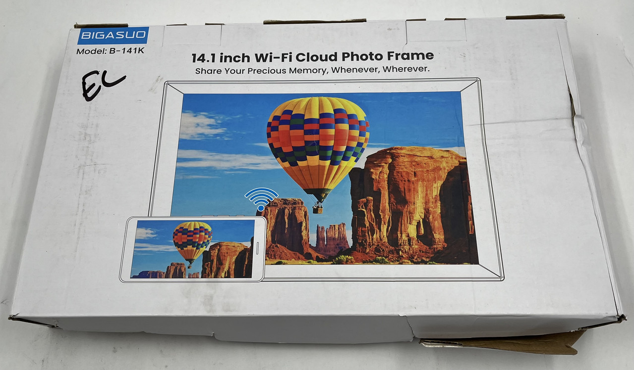 BIGASUO B-141K 14.1" WIFI CLOUD PHOTO FRAME This item is new and internally sealed in original box with slight freight wear as shown.