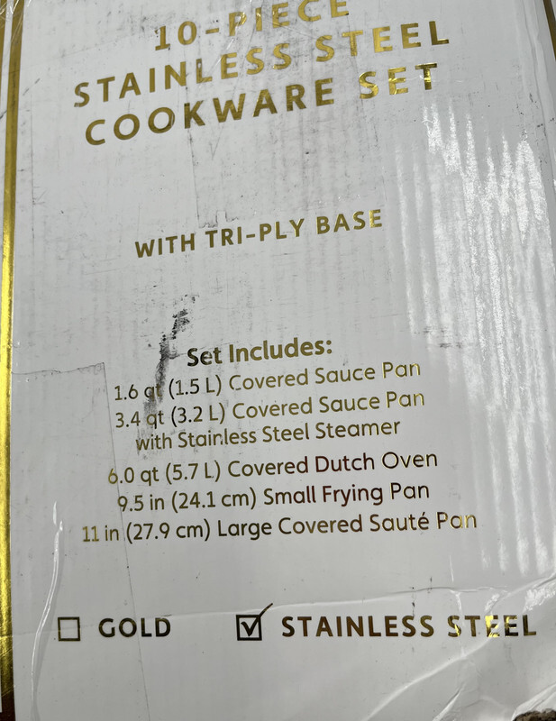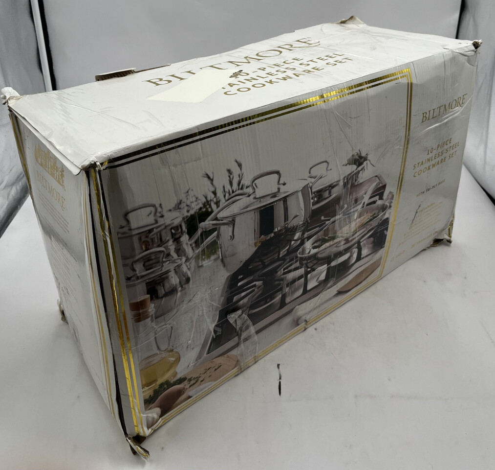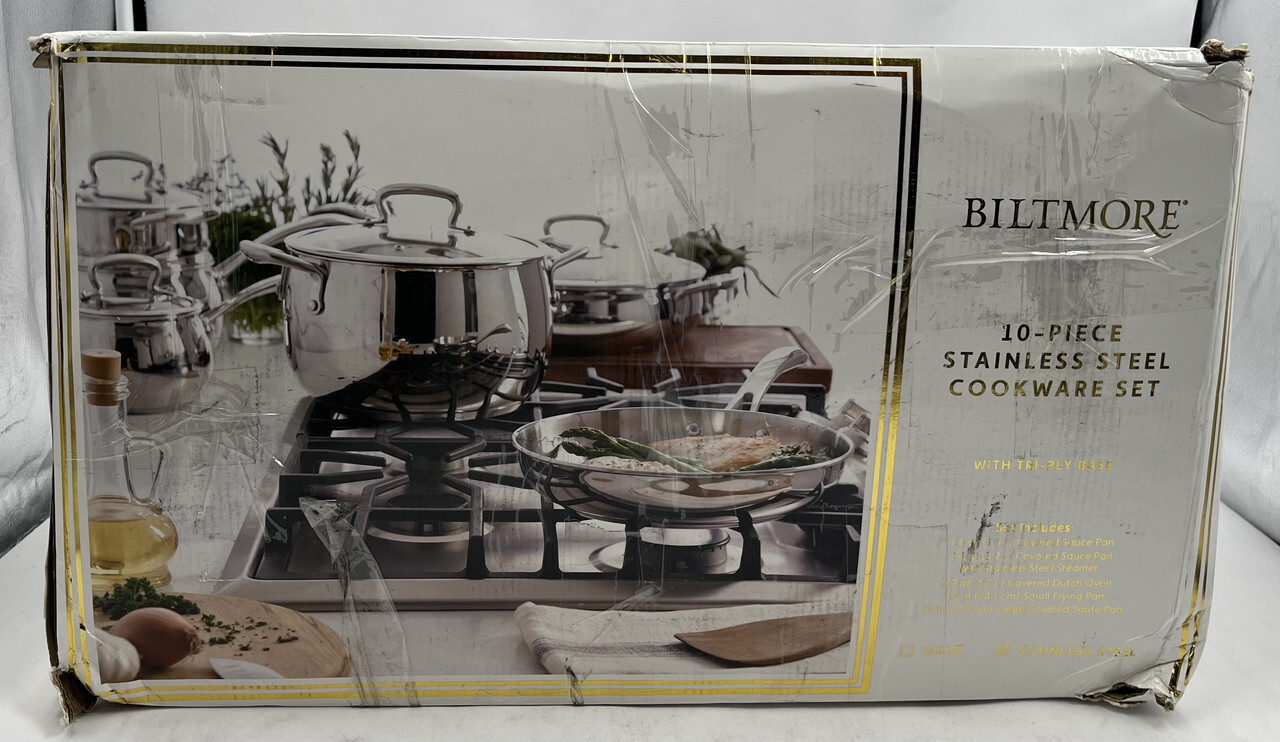 Biltmore 10 Piece Stainless Steel Cookware Set with Tri-ply Base This item is new in a freight worn box as shown