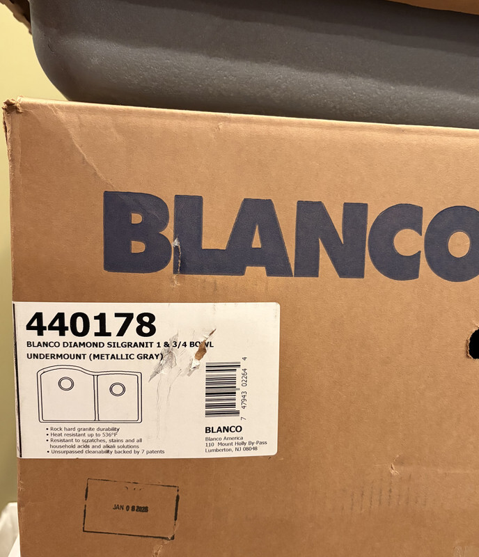 Blanco 440178 Diamond Silgranit 60/40 Undermount Sink Metallic Gray This sink has manufactor packaging and original box as shown. Dimensions include: required outside cabinet 36". The larger bowl is 9-1/2" and the smaller is 8" deep.