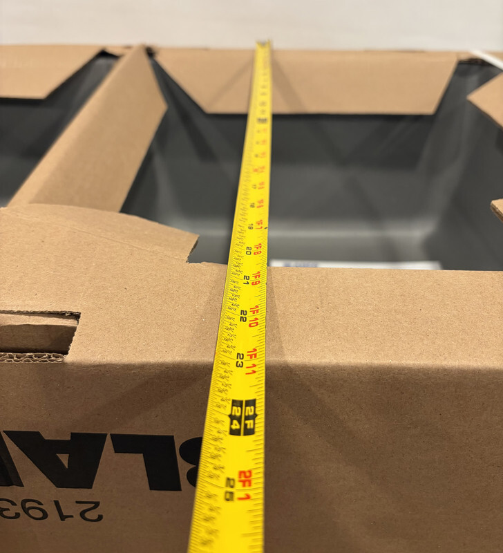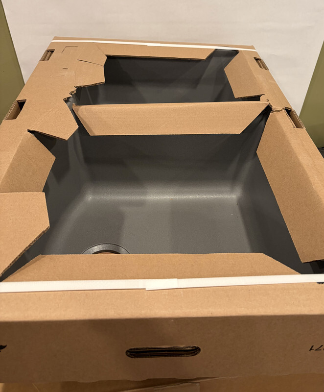 - Notes: This sink has manufactor packaging and original box as shown. Dimensions include: required outside cabinet 36". The larger bowl is 9-1/2" and the smaller is 8" deep.