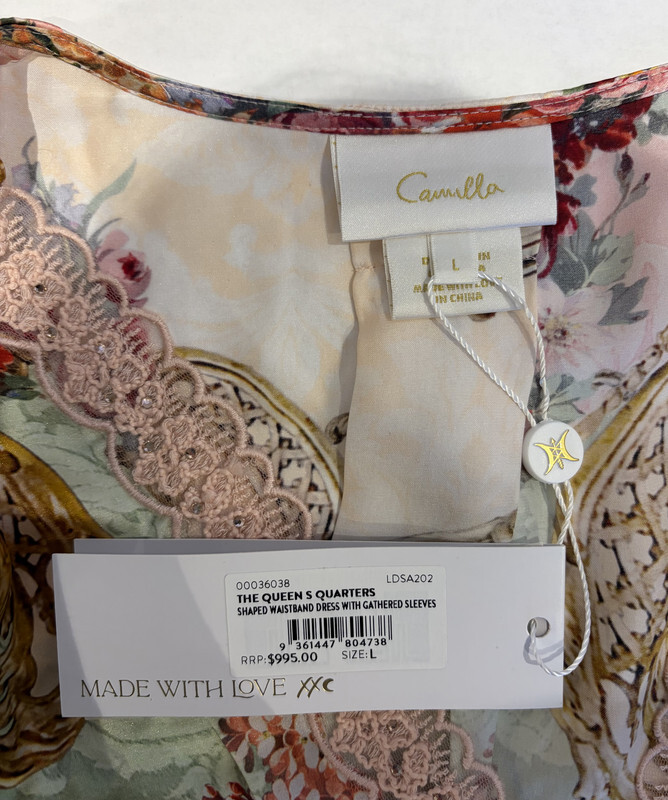 CAMILLA THE QUEENS QUARTERS WAISTBANDED DRESS W/ GATHERED SLEEVE L $995 LDSA202 This item is new with original tags as shown.