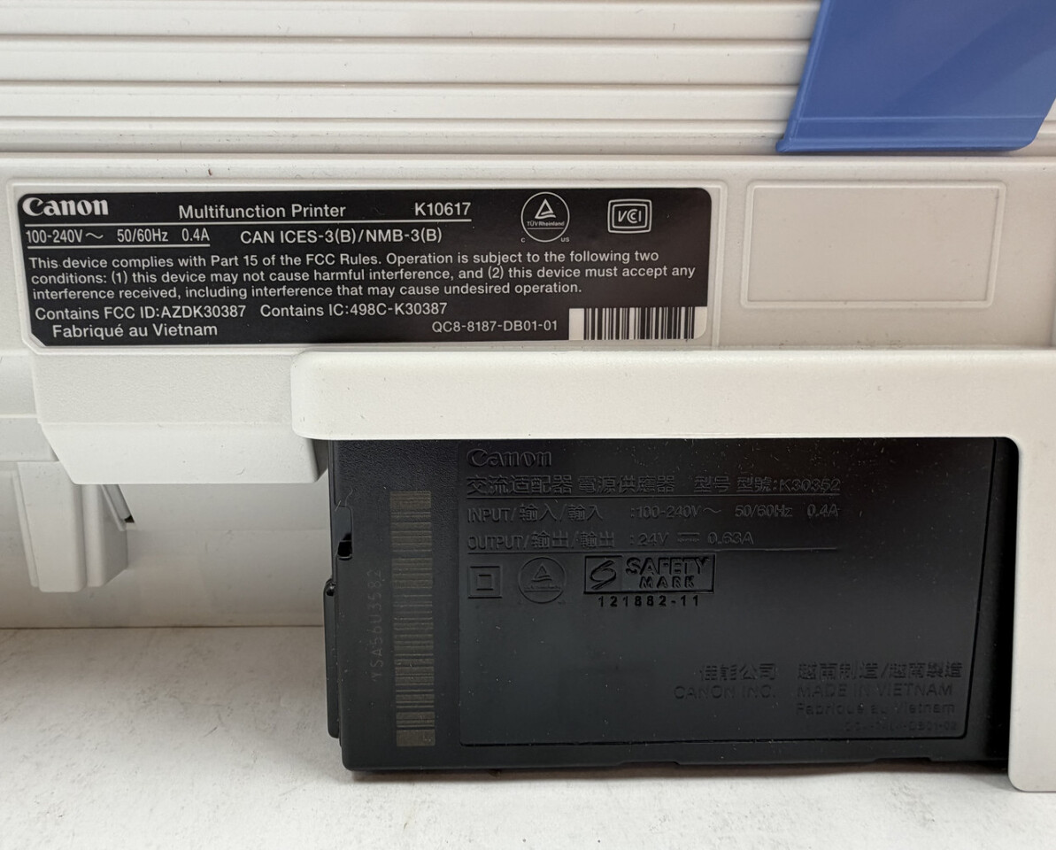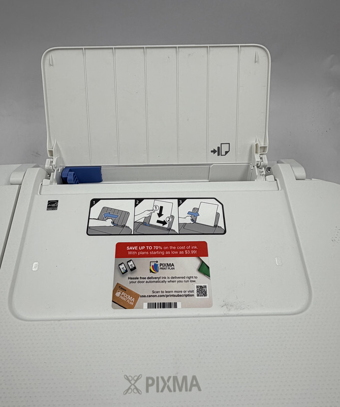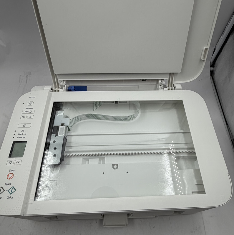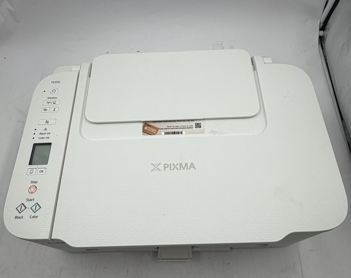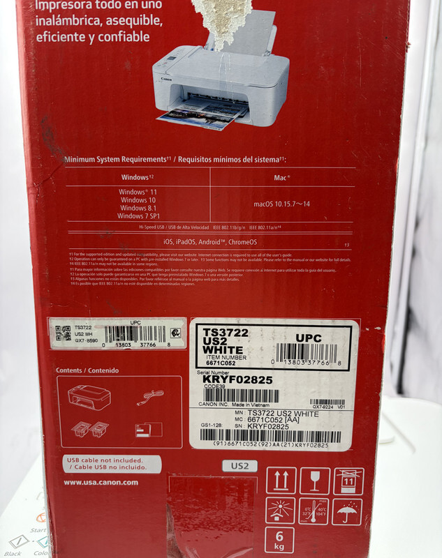 Canon Pixma TS3722 All in one home printer with scanner and copier White This item is new with power cord and orignal freight worn box as shown