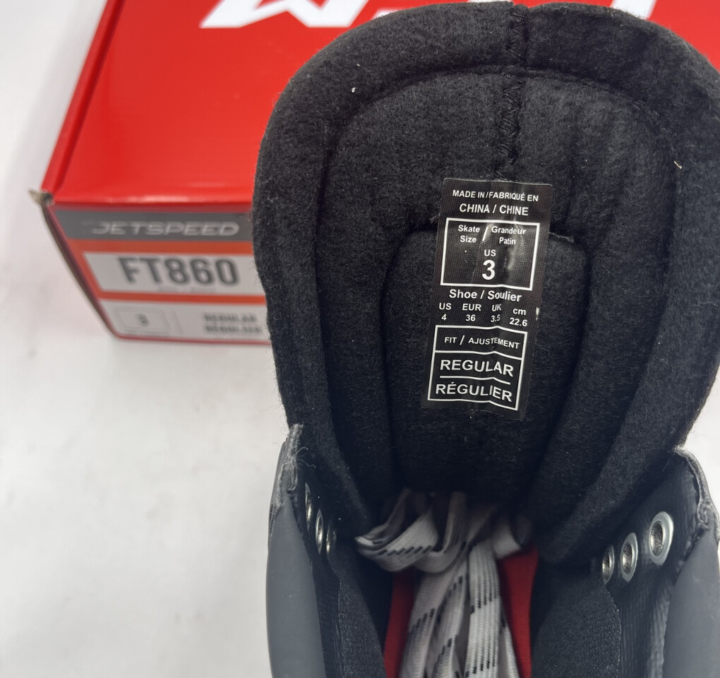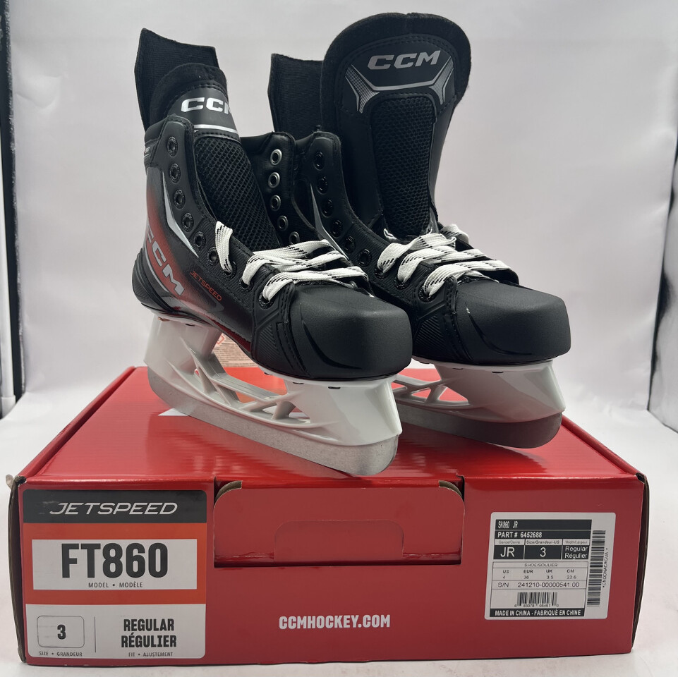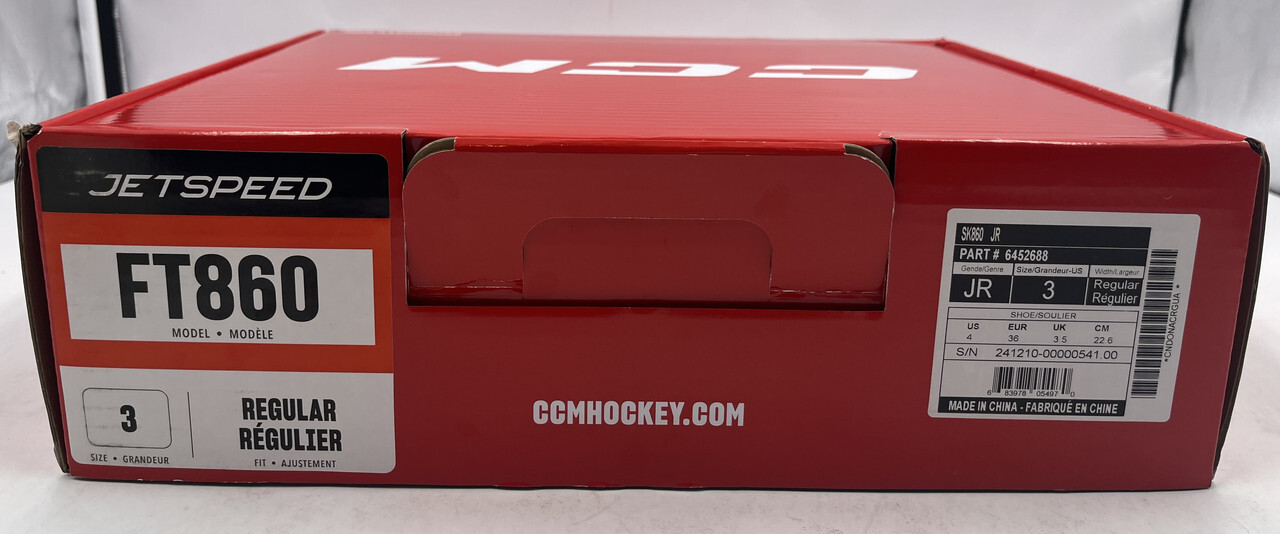 CCM JETSPEED FT860 6452688 JR SKATE SIZE 3 SHOE SIZE 4 REGULAR ICE HOCKEY SKATES These skates are brand new in original box as shown.