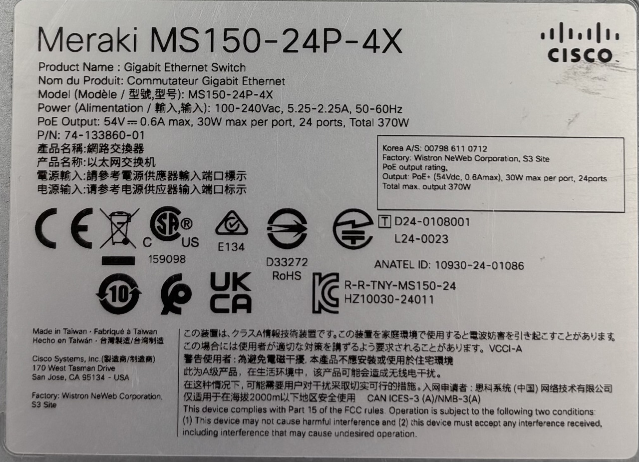Cisco Ms150-24p-4x 74-133860-01 Meraki 24 Ports Managed Gigabit Mountable Switch This item is new without accessories as shown.