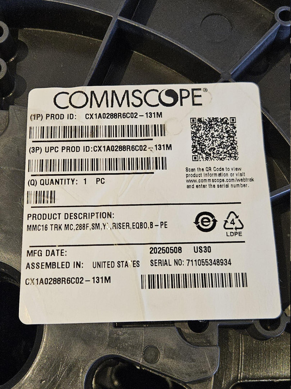 COMMSCOPE CX1A0288R6C02-131M MMC16 FIBER TRUNK CABLE MC 288F SM YL RISER EQB0 B-PE This item is new in an open box as shown.