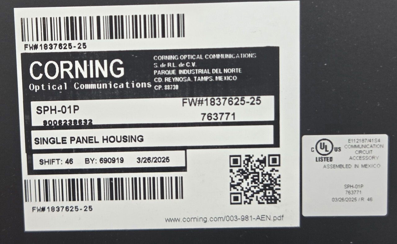 Corning Sph-01p Black Wall Mountable Single Panel Fiber Optic Housing This item is new as shown.