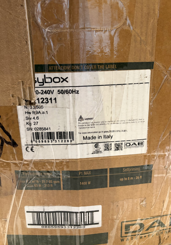 DAB ESYBOX 6021311 CONSTANT AUTO PRESSURE BOOSTER PUMP SYSTEM 2HP 200V 1PH 1"X1" This item has scuffs from shipping wear & also comes in a freight worn box as shown