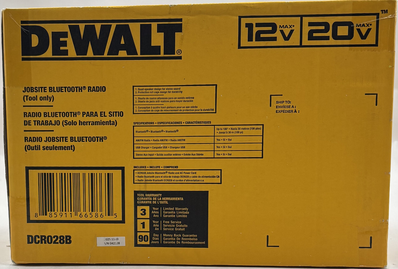 DEWALT DCR028B JOBSITE BLUETOOTH RADIO 12V 20V CORDED OR CORDLESS TOOL ONLY This item is new and sealed as shown.