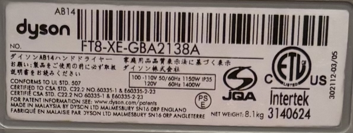 Dyson AB14 FT8-XE-GBA2138A Airblade Hand Dryer 120V 60Hz Grey This item is used and comes with some damage on the bottom as shown.