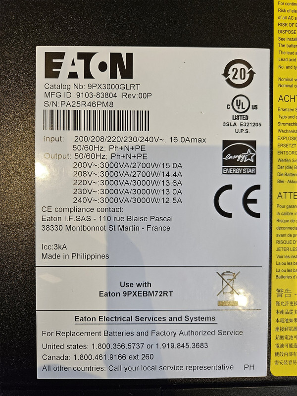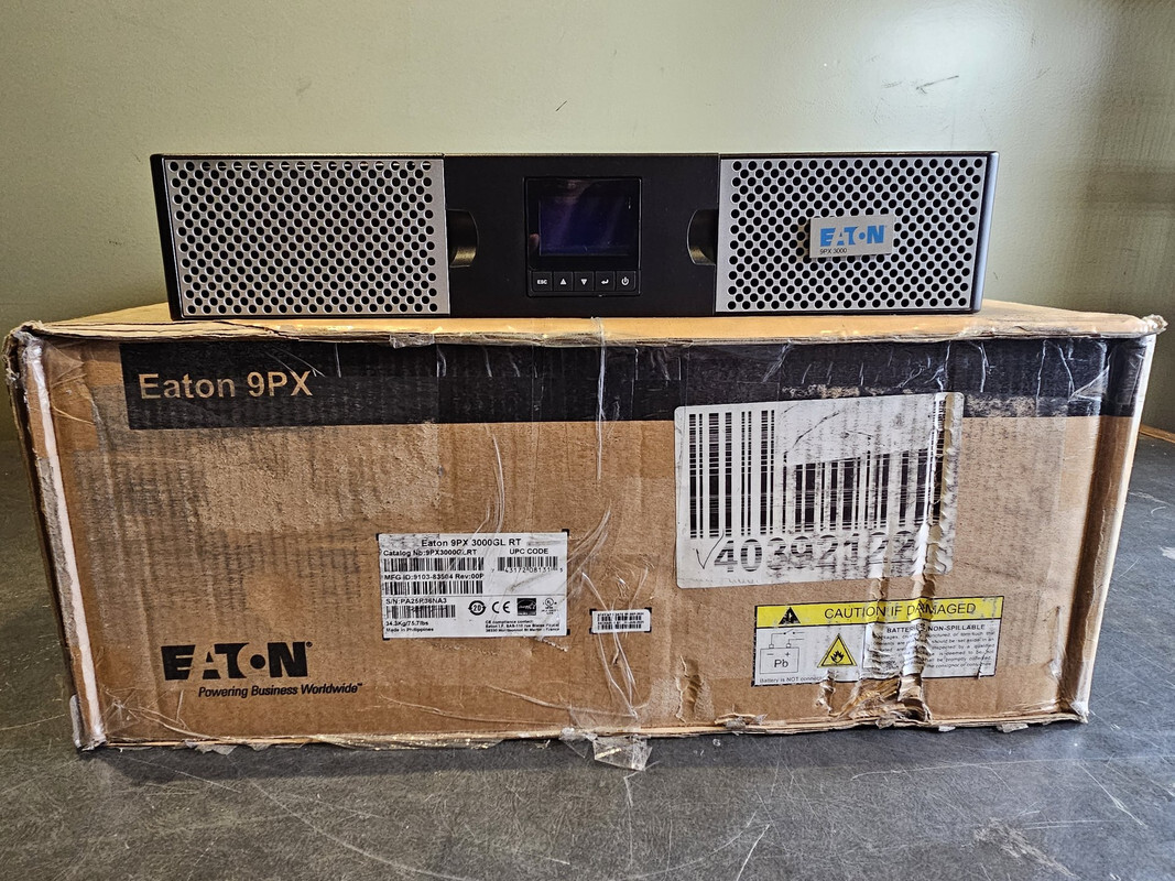 Eaton 9PX UPS, 3000 VA 3000 W L6-20P Input/Outputs: (2) L6-20R, (1) L6-30R, 208V This item comes without power cord in an opened box shown.