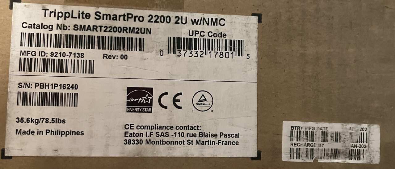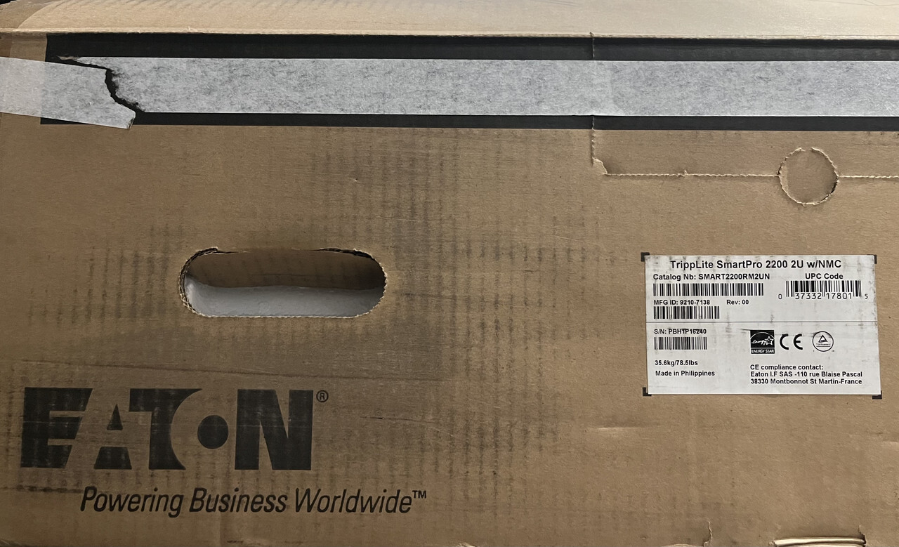 Eaton Smart2200rm2un Smartpro 2u 1950va 1920w 120v Line Interactive Sine Wave Ups System This item is new as shown.
