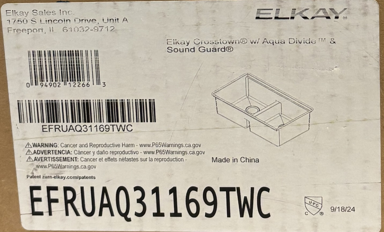 ELKAY 31.5" EFRUAQ31169TWC CROSSTOWN AQUA DIVIDE STAINLESS STEEL DOUBLE SINK KIT This item is new and comes in the original box as shown.