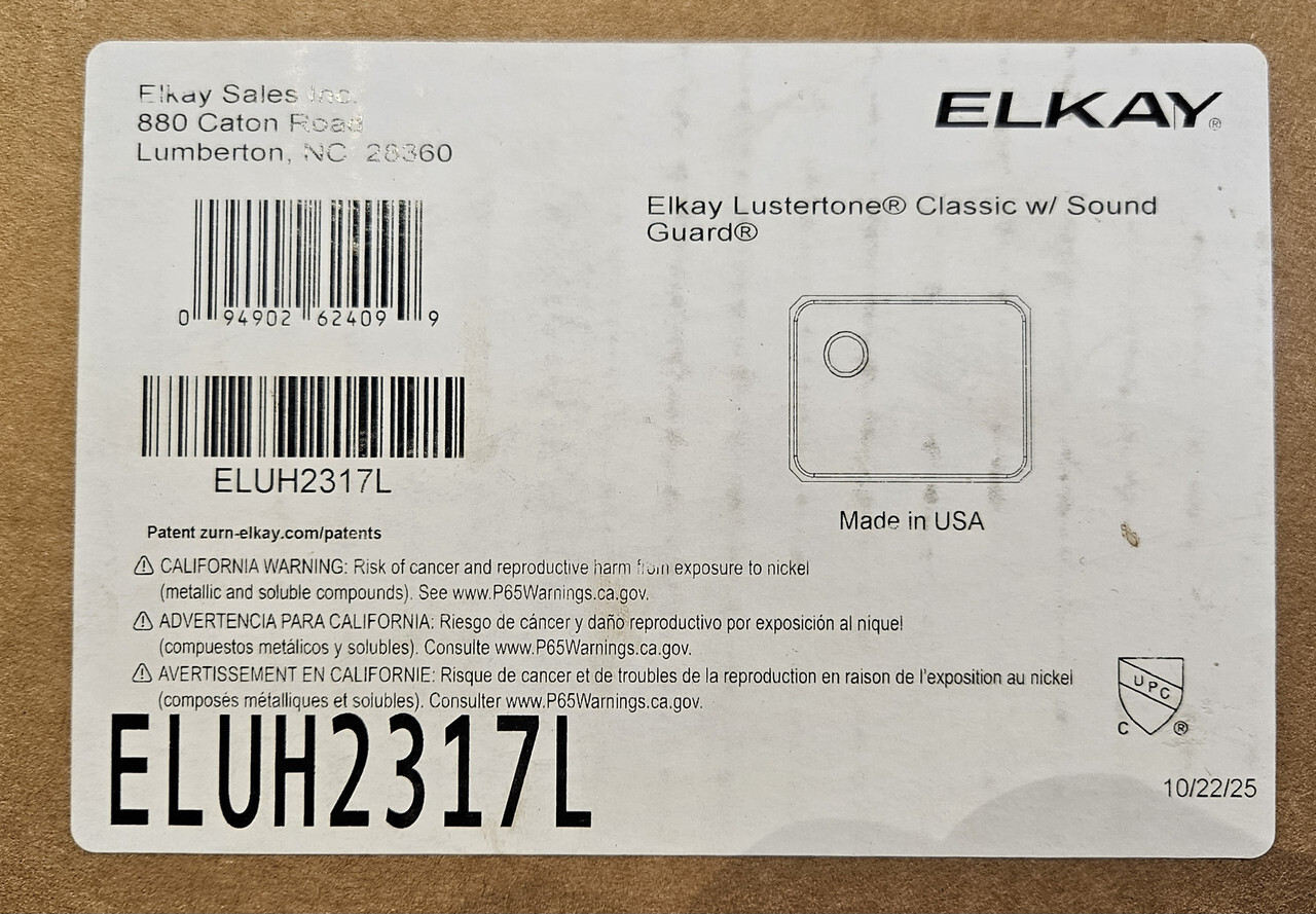 ELKAY ELUH2317L Lustertone SS 25.5" Classic Single Bowl W/ Sound Guard Left Drain This item is new in a sealed, freight-worn box as shown.
