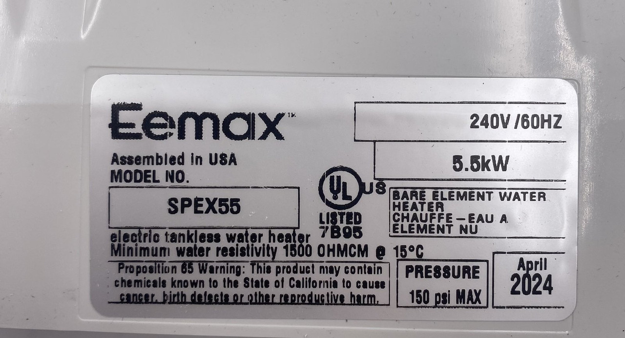 ENERGYGUIDE EEMAX SPEX55 FLOWCO ELECTRIC TANKLESS WATER HEATER 5.5KW 240V This item is new in sealed original box as shown. One box was opened for internal pictures.