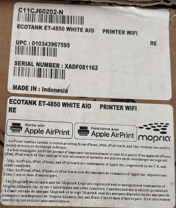Epson Ecotank ET-4850 C611B Multifunction Printer White Inkjet This item is newly refurbed as shown.