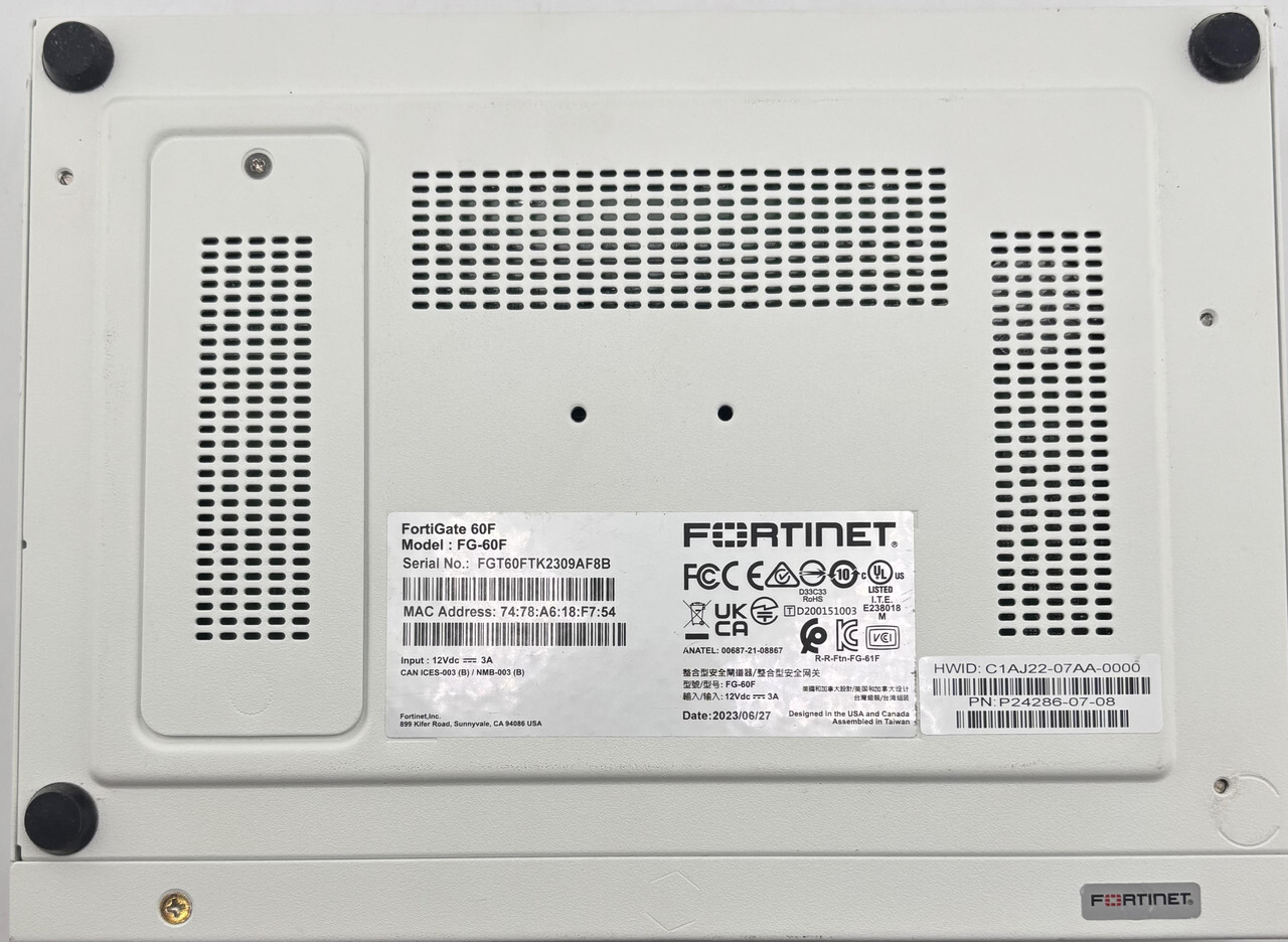 Fortinet Fg-60f Fortigate 60f Wifi Firewall Network Security Appliance This item is used w/out cables or accessories as shown.
