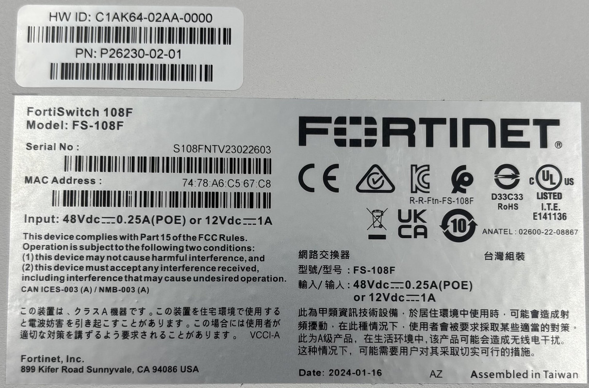 FORTINET FS-108F P26230-02-01 FORTISWITCH 108F MOUNTABLE NETWORK POE SWITCH This item is new as shown.