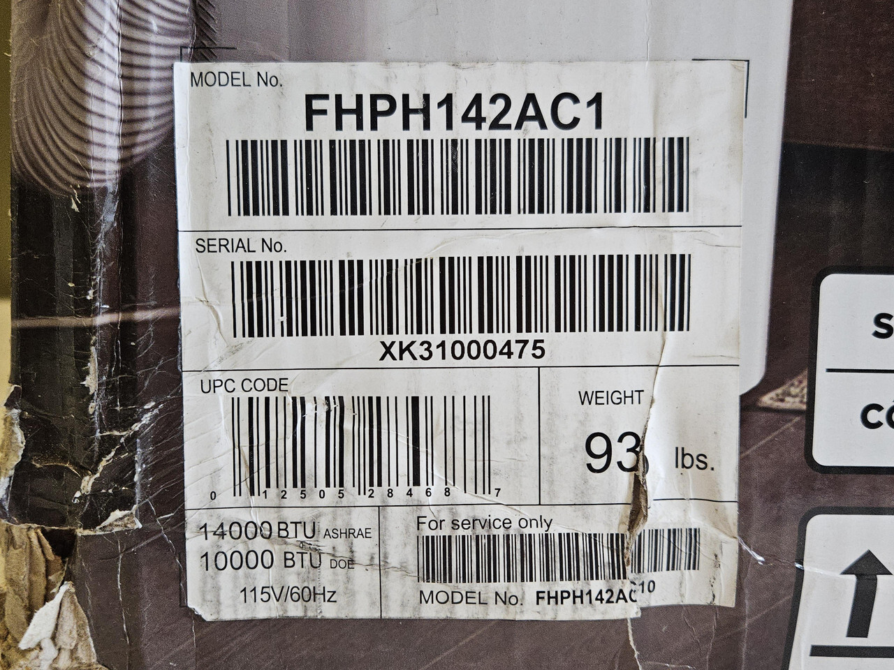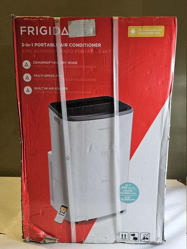 Frigidaire FHPH142AC1 3-in-1 Portable Air Conditioner 14K BTU (Ashrae) 10K BTU (DOE) This item is brand new in a freight worn box as shown.