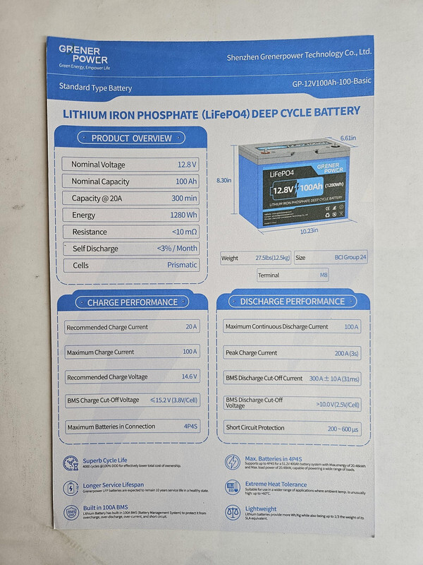 GrenerPower 12.8V100Ah LiFePO4 Lithium Battery Built-in 100A BMS 1280Wh Energy This item is brand new in a freight worn box as shown