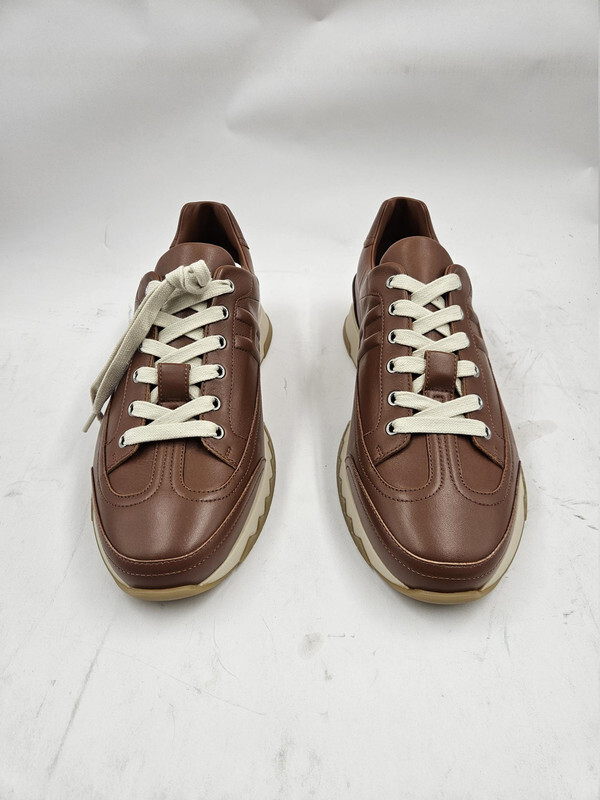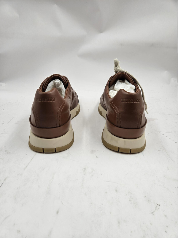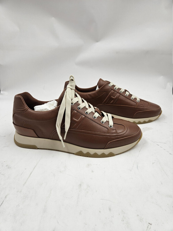 HERMÈS H191395ZH20440 TRAIL CALF SKIN SNEAKERS GOLD / BROWN US 11 EU 44 This item is new in the original slightly freight worn box with a second pair of shoelaces included as shown. Sneaker in calfskin. Honey rubber sole.