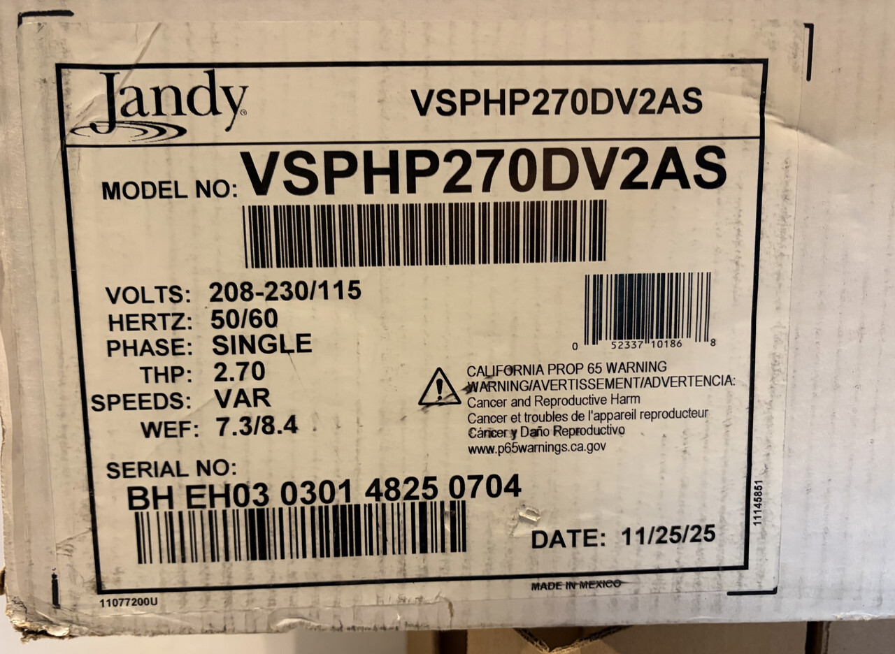 Jandy VS PLUS HP 2.7 THP Variable Speed Pool Pump w/ Controller VSPHP270DV2AS This item is new in original open box as shown.