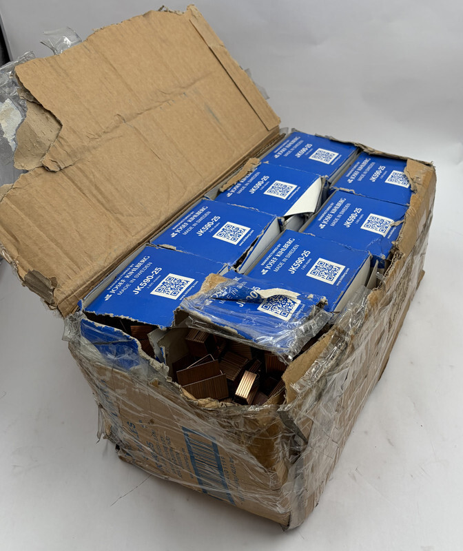 Josef Kihlberg Staples JK590-25 8 coppered boxes of 2800 New These staples are in new condition in a freight worn box with outer damage to one of the 8 boxes (staples uneffected) as shown.