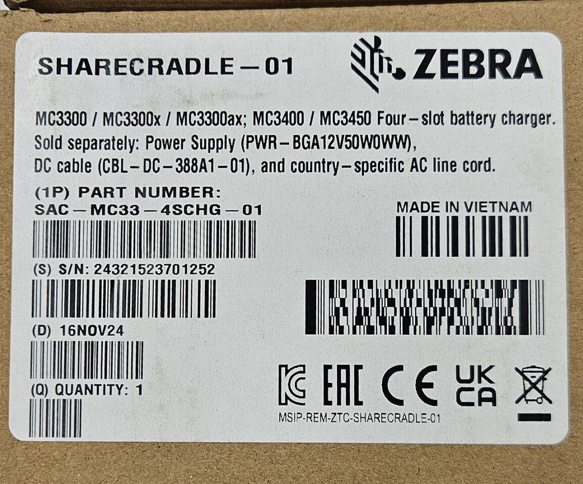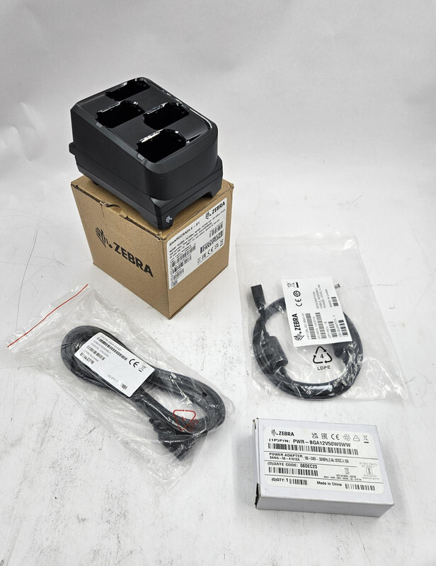 Kit Zebra SAC-MC33-4SCHG-01 Battery Charger (4-Slot) W/ PS, DC Line & Wire AC Line Cord This SHARECRADLE-01 is new in an open box as shown. Compatible with MC3300 / MC3300x / MC3300ax; MC3400 / MC3450 (fast-charging while using MC33 PP+ batteries) and comes with a Power Supply PWR-BGA12V50W0WW, DC line cord CBL-DC-388A1-01 and country specific 3 wire AC line cord 23844-00-00R.