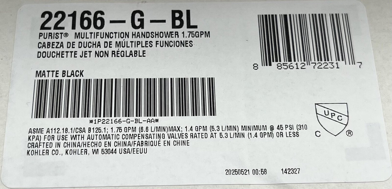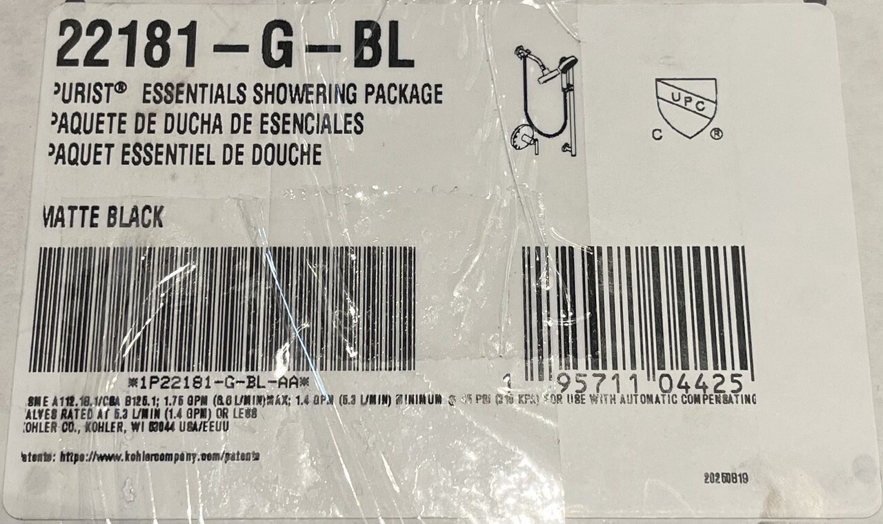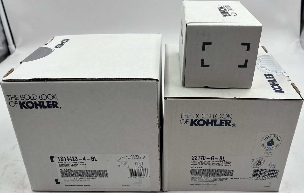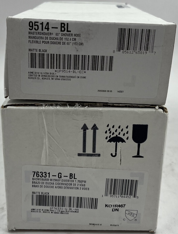 KOHLER 22181-G-BL MATTE BLACK ESSENTIALS SHOWERING PACKAGE 1.75 GPM These items are brand new in box as shown.
