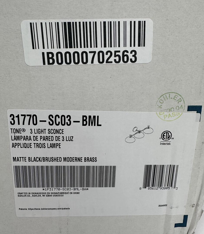 KOHLER 31770-SC03-BML 3 LIGHT SCONCE MATTE BLACK/BRUISED MODERNE BRASS This item is sealed in a freight worn box.