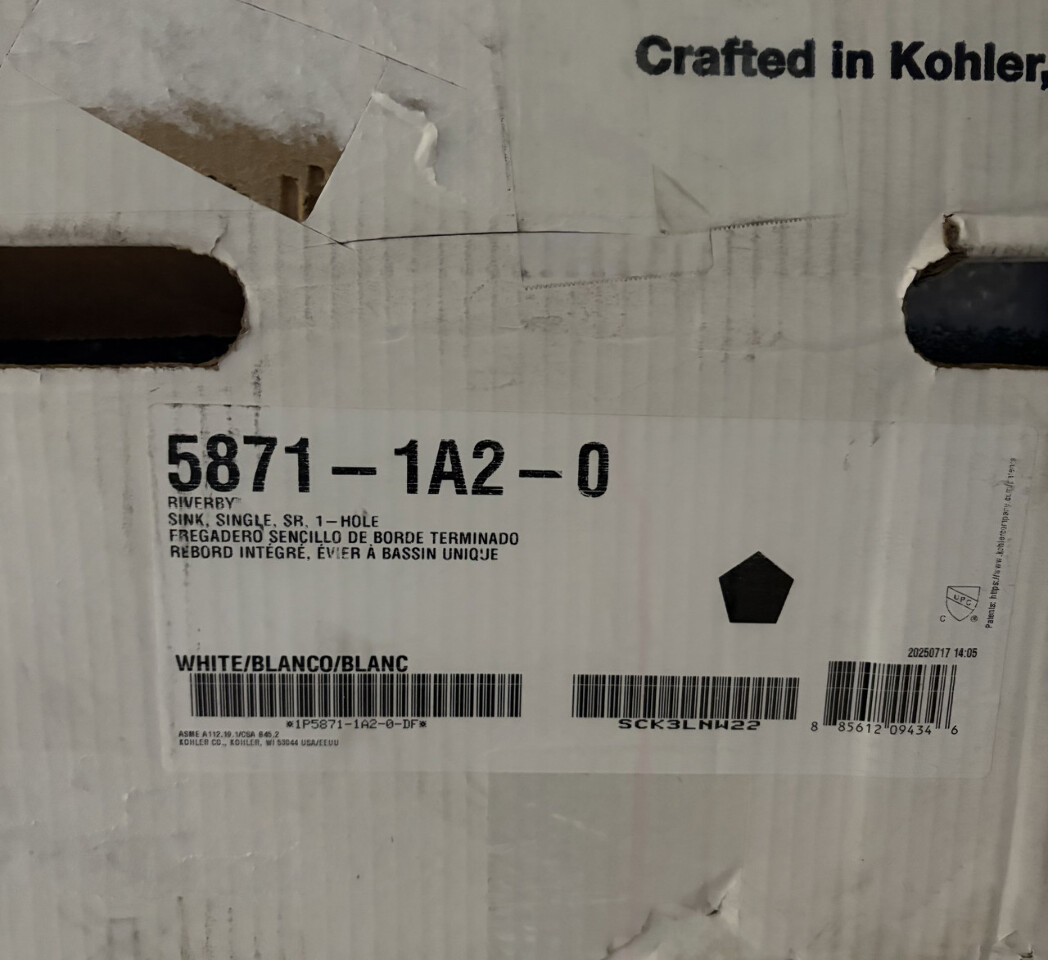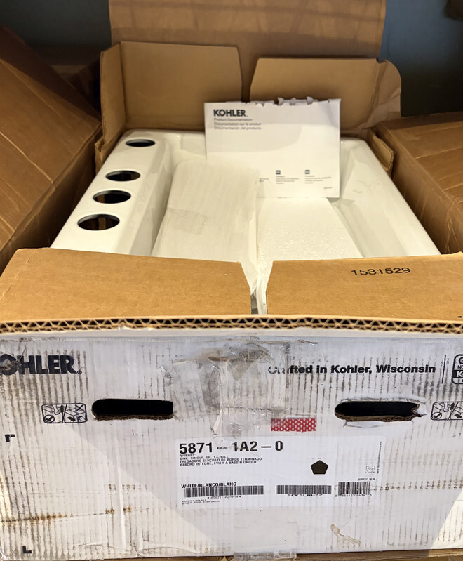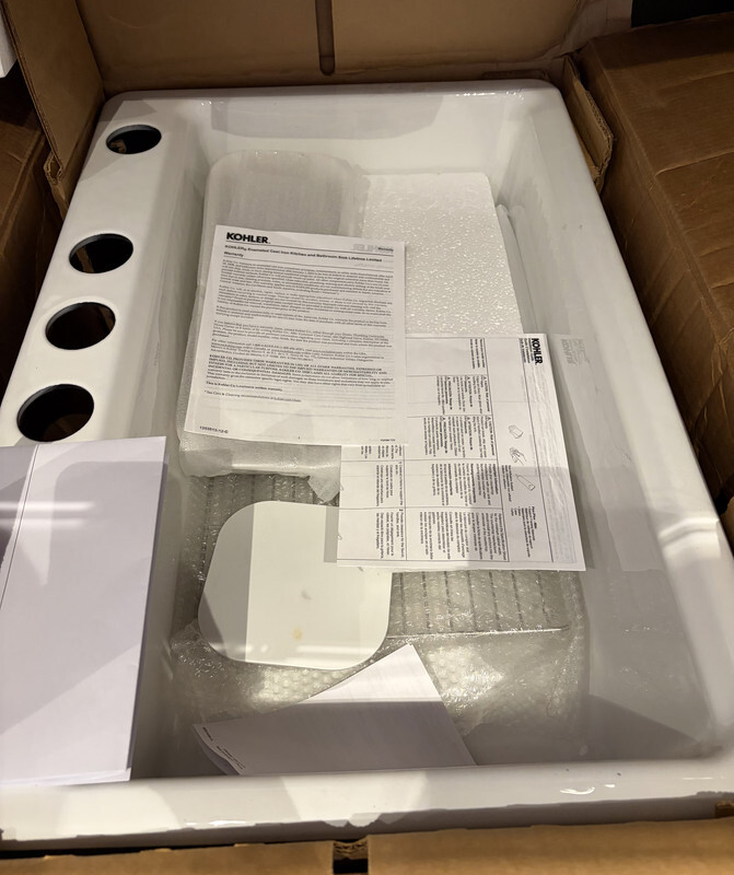 Kohler 5871-1A2-0 Riverby Sink SR 1 hole cast iron kitchen sink white This sink has manufactor packaging and original freight worn box as shown. One accessory has cosmetic ware as shown. Dimensions include: 33" x 15.75" X 9.7"