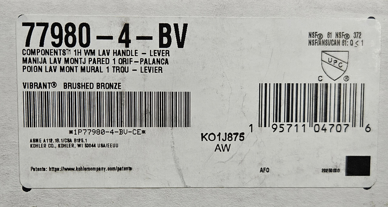 KOHLER 77980-4-BV Components Wall-mount bathroom sink faucet handle This item is new in a sealed box as shown.
