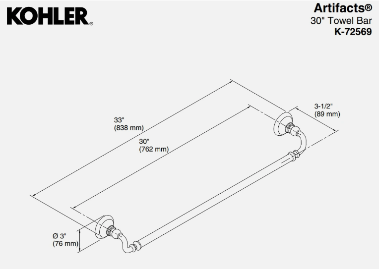 Kohler K-72569 Artifacts 30" Towel Bar in Gold See Description This item is in new condition without hanging accessories (paper guide, screws etc) or orginal box as shown. This item is 33x3.5x3"