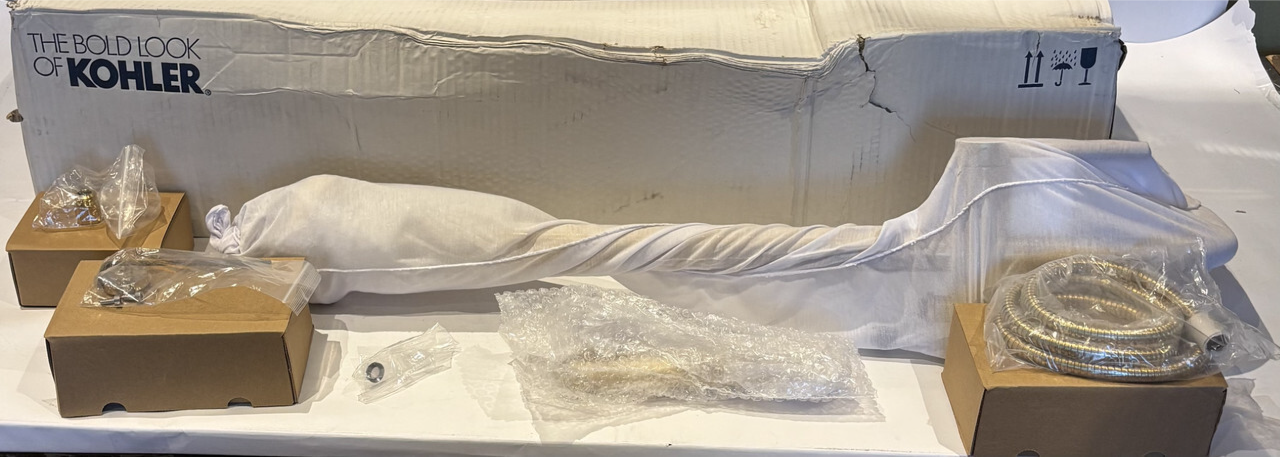 Kohler T97328-4-2MB Purist Freestanding Bath Faucet Vibrant Brushed Modern Brass This item is new and comes in a frieght worn box as shown.
