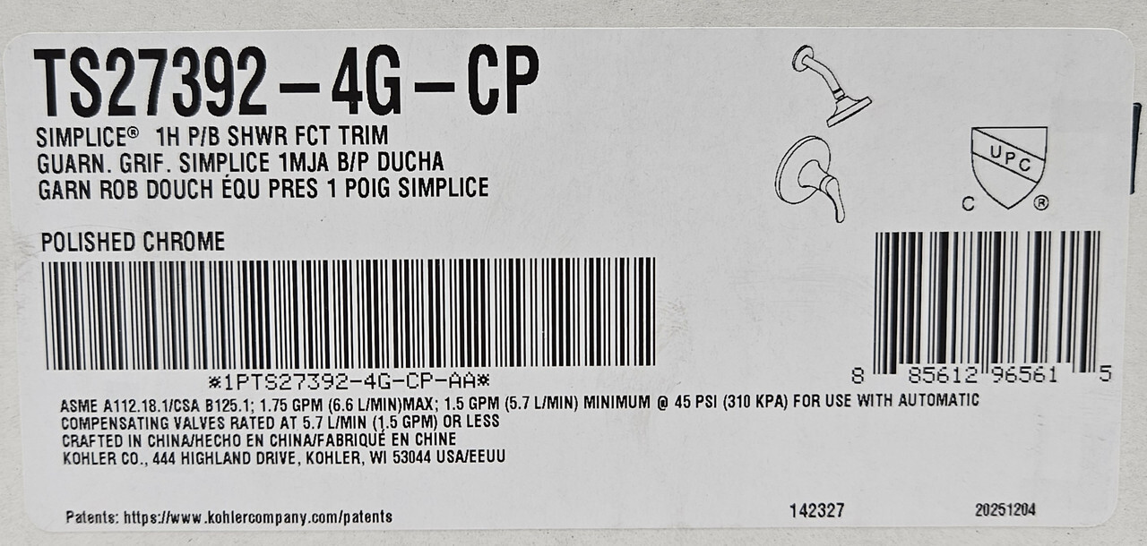 KOHLER TS27392-4G-CP Simplice Rite-TempĀ® shower trim kit 1.75 gpm Polish Chrome This item is new in a sealed box as shown.