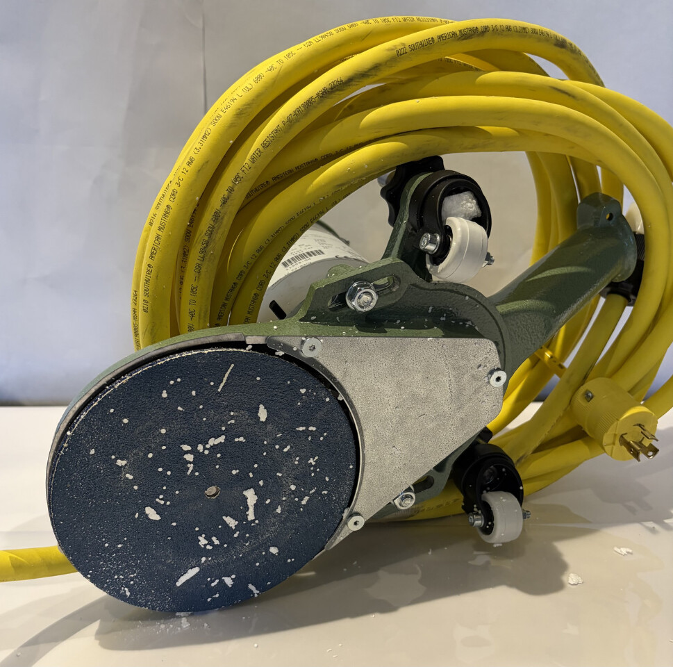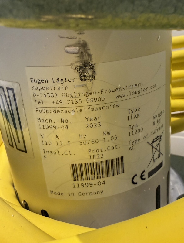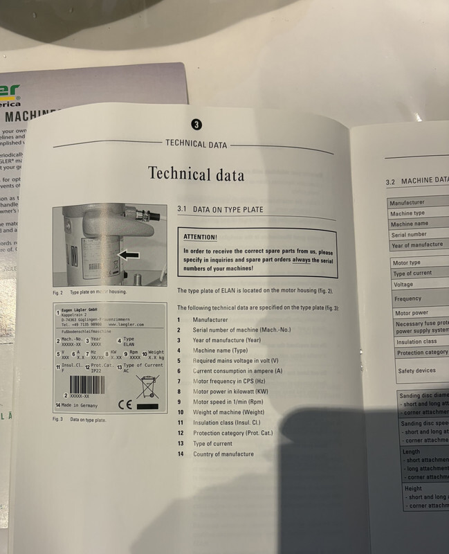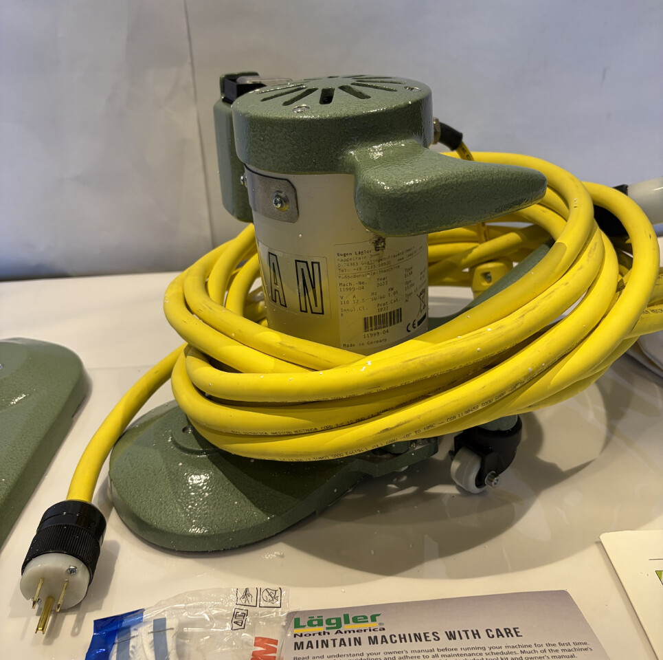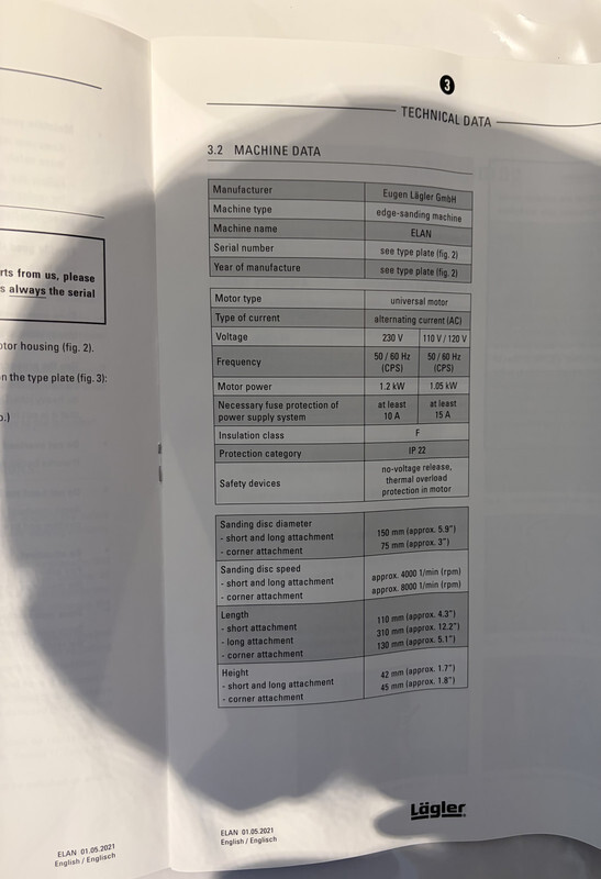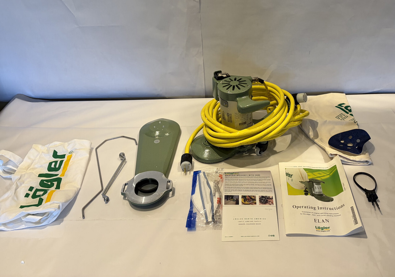 Lagler Elan Edge Stair Corner Sanding Machine V110 HZ 50/60 Kw 1.05 AC current This item is in open box condition with accompanying accessories as shown. Styrofoam on sanding disk, easily removed once used.
