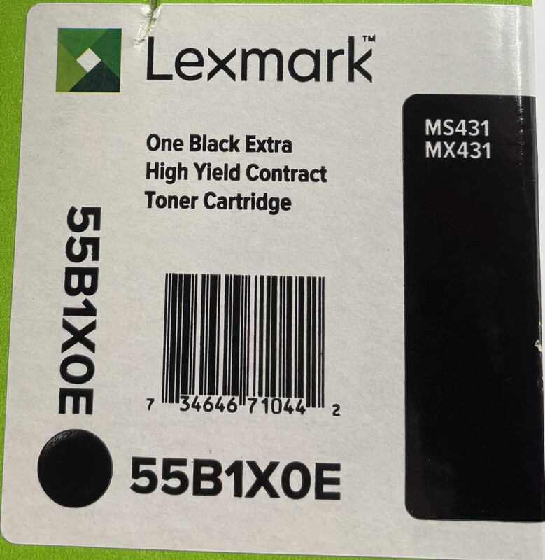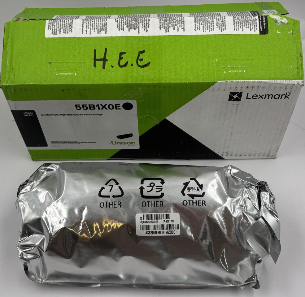 LEXMARK GENUINE 55B1X0E ONE BLACK HIGH YIELD CONTRACT TONER CARTRIDGE This item is new and comes in an open box as shown.
