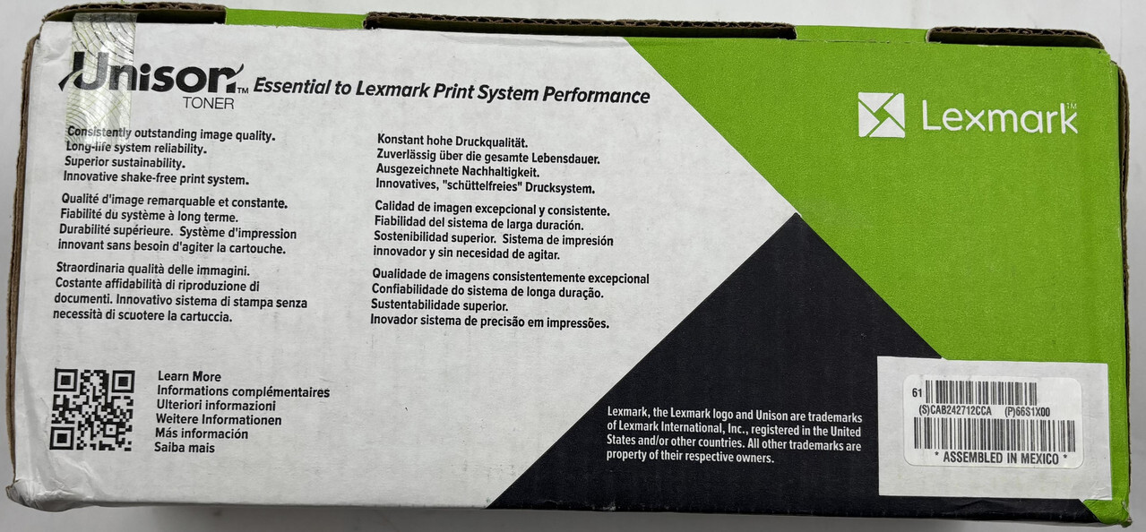Lexmark Unison 66S1X00 Extra High Yield Toner Cartridge This item is new and comes in a frieght worn box as shown.
