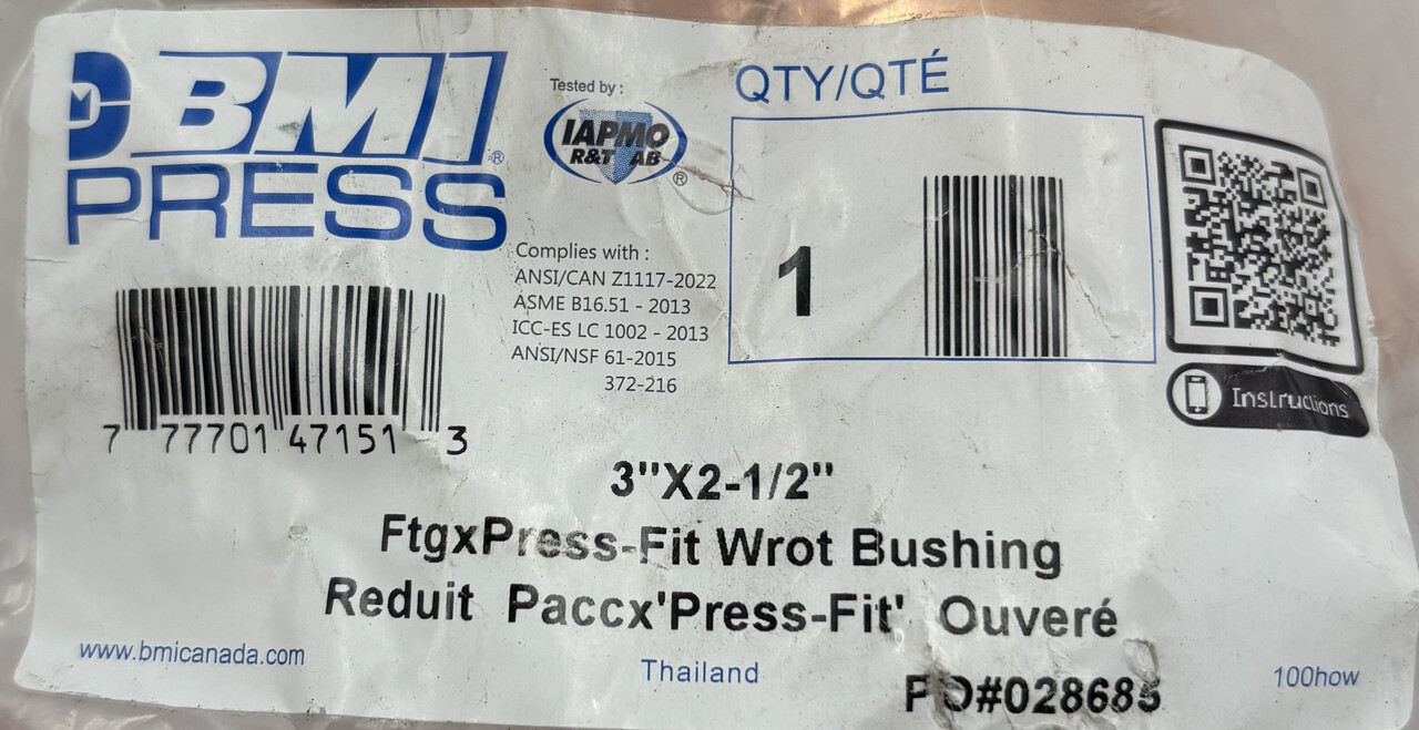 Lot of 13 BMI Press 47151 3X2-1/2 FTGxPRESS WROT COPPER PRESS-FIT BUSHING These items are new as shown.