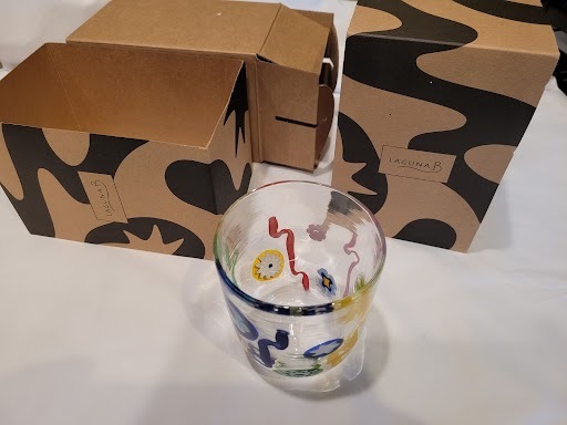 Lot of 6 LagunaB Fantasia Medium Colorful Glass Cup Handmade in Murano These items are brand new each glass is handmade in their own unique abstract way as shown.  Approximate measurements:  Width: 3 1/4".  Height: 3 3/4".